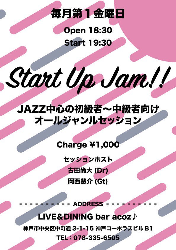 阪神電気鉄道・阪急電鉄の高速神戸駅、JR神戸駅近くのライブバーAcoz(アコズ)さんにて開催しているセッションイベント「アコズ第一金曜セッション(旧:Start Up Jam)」の紹介記事です。
